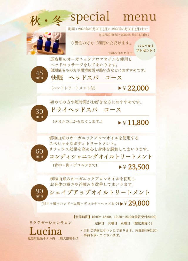 この機会に身も心もリラックスできる癒やしの時間をお過ごしください。