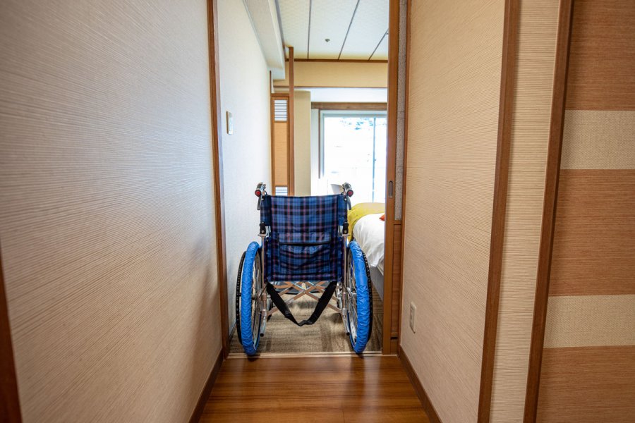 お部屋の入口に段差があります。入口で車椅子を降りていただくか、お部屋内で車椅子をご利用の場合はタイヤカバーを付けていただけますようお願いいたします。