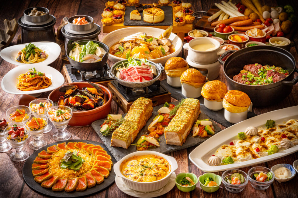 石窯ダイニング楽炎のブッフェでは2025年12月8日~2026年2月28日の期間に、あったか手作り料理と、館内イルミネーションを楽しむ「あったか煌めきフェア」を開催いたします。