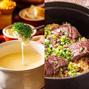 洋食のお鍋料理はチーズフォンデュをご用意、ローソクの灯火がテーブルに花を添えます。お好みの食材をディップしてお召し上がりください。シーフードチャウダーのパイ包みは、魚介の旨味が溶け込んだクリーミーなスープに、パイを浸して一緒にどうぞ。