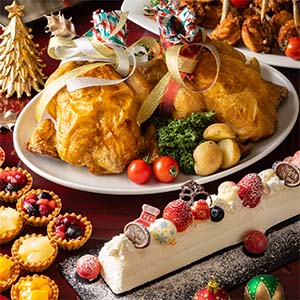 定番のローストチキンや、骨付き唐揚げのチューリップ。デザートには可愛くデコレーションされたホワイト・ブッシュ・ド・ノエルをぜひお召し上がりください。