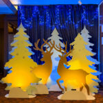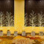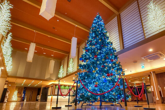 ロビー周辺にスノーツリーや光り輝くツリー、中央には大きなツリーを設置いたしました。