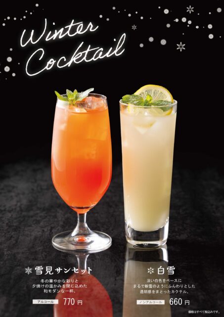 まるで冬の美しい夕焼けのような和モダンなカクテル、淡い白色で新雪をイメージしたノンアルコールカクテルの2種類です。