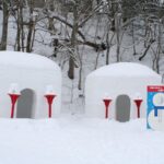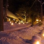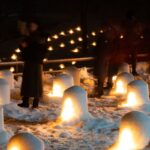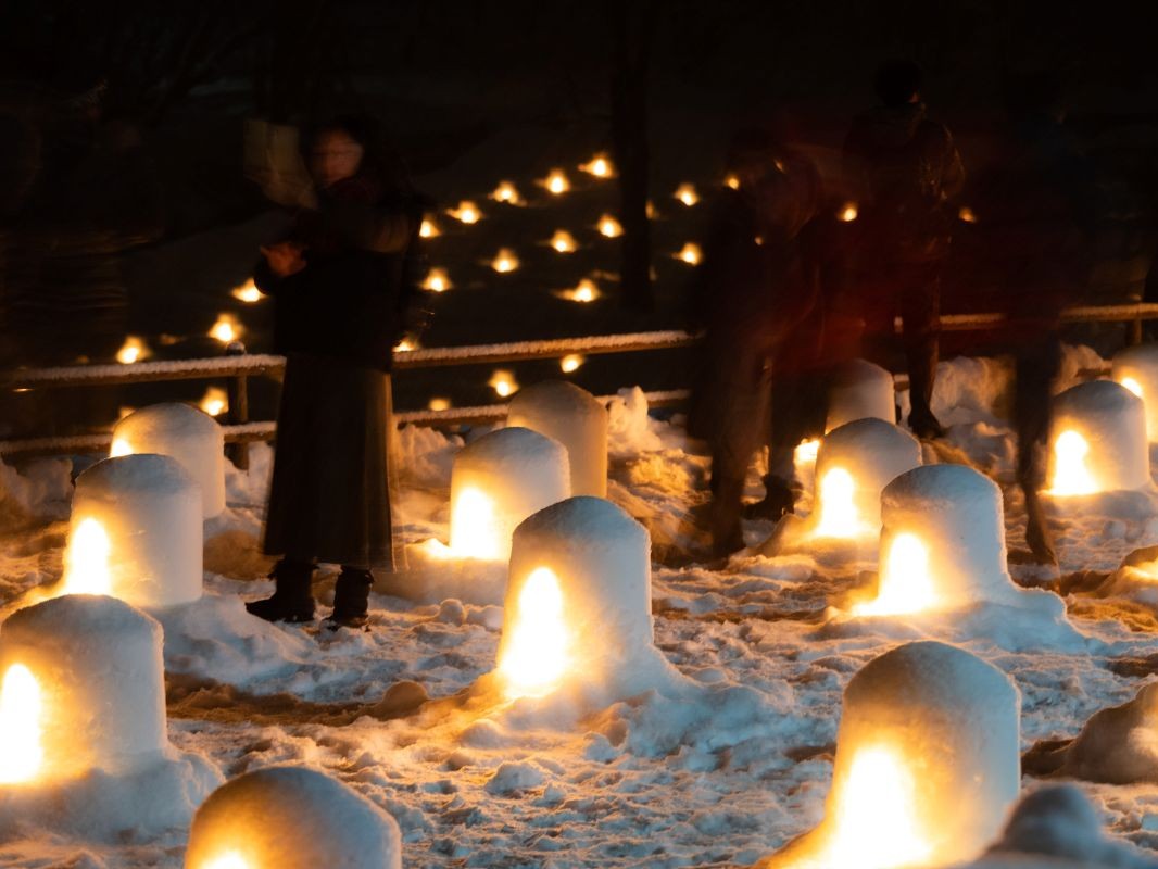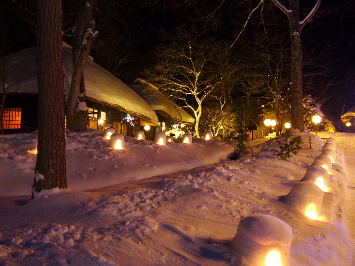 一面に広がるミニかまくらの灯りや、雪化粧した茅葺屋根の古民家とかまくらのライトアップをお楽しみいただけます。