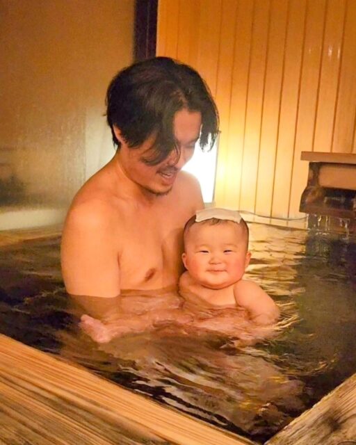 パパに抱っこされながらお湯に浸かる