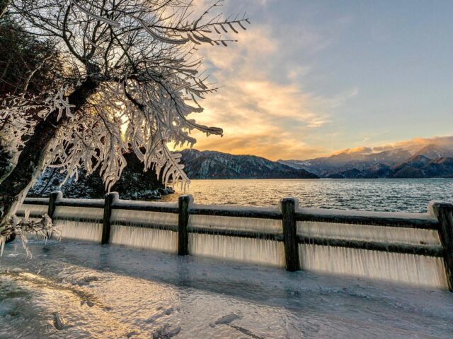 湖の水しぶきだけで木の枝や柵まで凍っていて、
