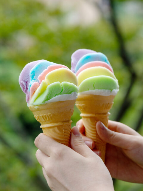 かわいらしいポップな見た目で、ひとくち食べるとさっぱりした甘さが広がるレインボーアイスは