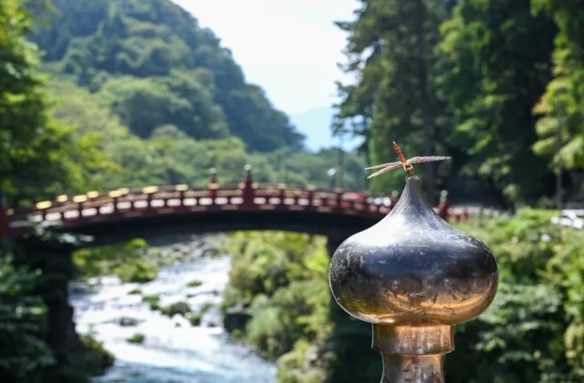 夏の深緑と神橋を背景に、赤とんぼをパシャリ。季節の移り変わりが感じられますね。