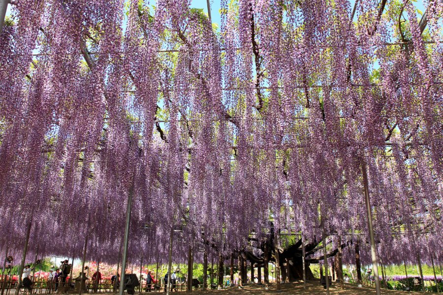大藤 4本 ( 野田九尺藤 3本、八重黒龍藤 1本 ) と 80m におよぶ白藤のトンネルは栃木県天然記念物に指定されています。世界一の美しさを誇る大藤棚は圧巻です。